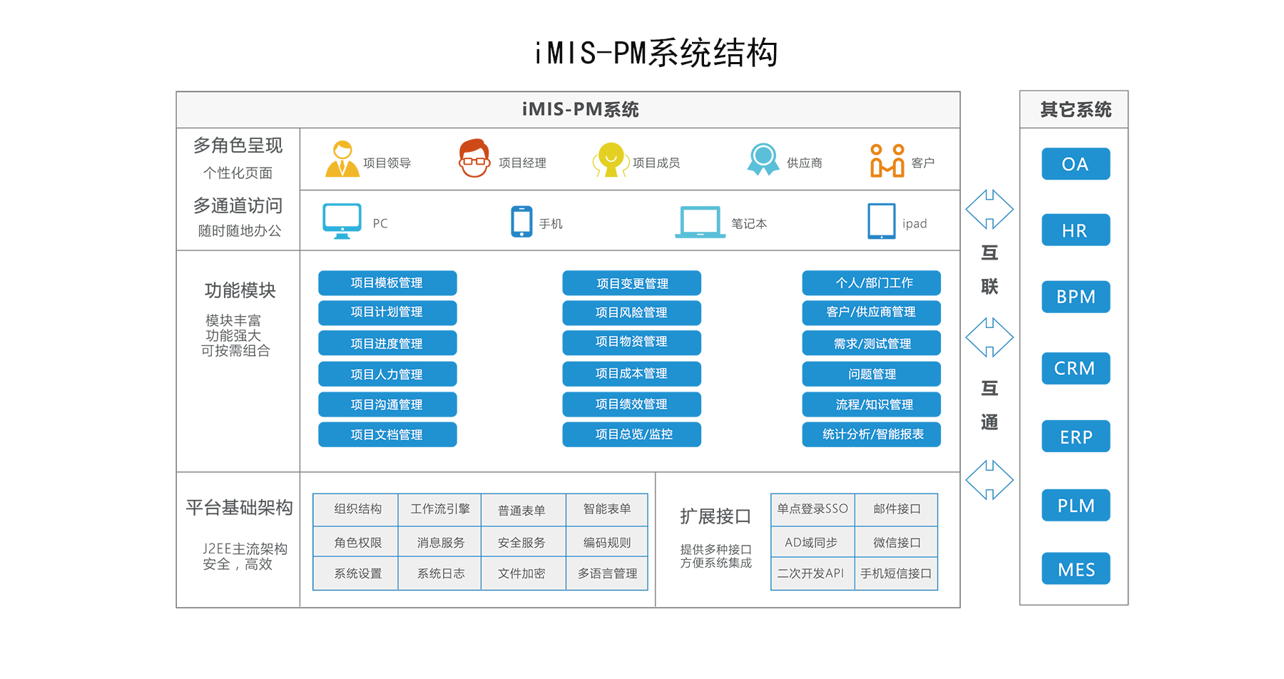 捷为iMIS-PM集成项目管理系统是组织级的项目管理系统,管理项目启动、计划、执行、监控和收尾的整个生命周期,覆盖进度、质量、成本、资源、风险等项目管理的各个要素。