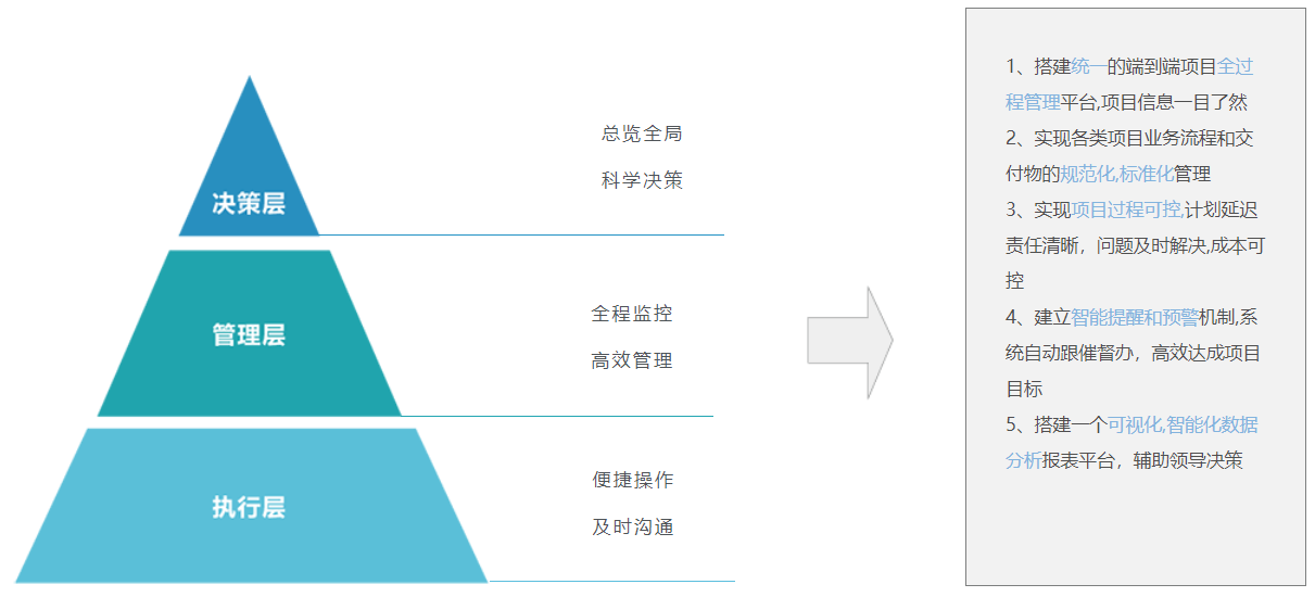 第五、构建集成项目、流程、知识的信息化平台,实现决策、管理、执行一体化运作,满足不同层级用户的个性化管控需求。