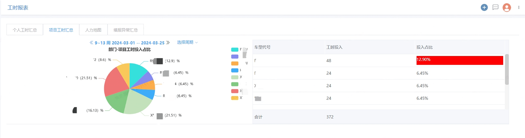 ▲系统能够按照部门显示整个项目工时投入占比,并且还能按月/季/年进行汇总。
