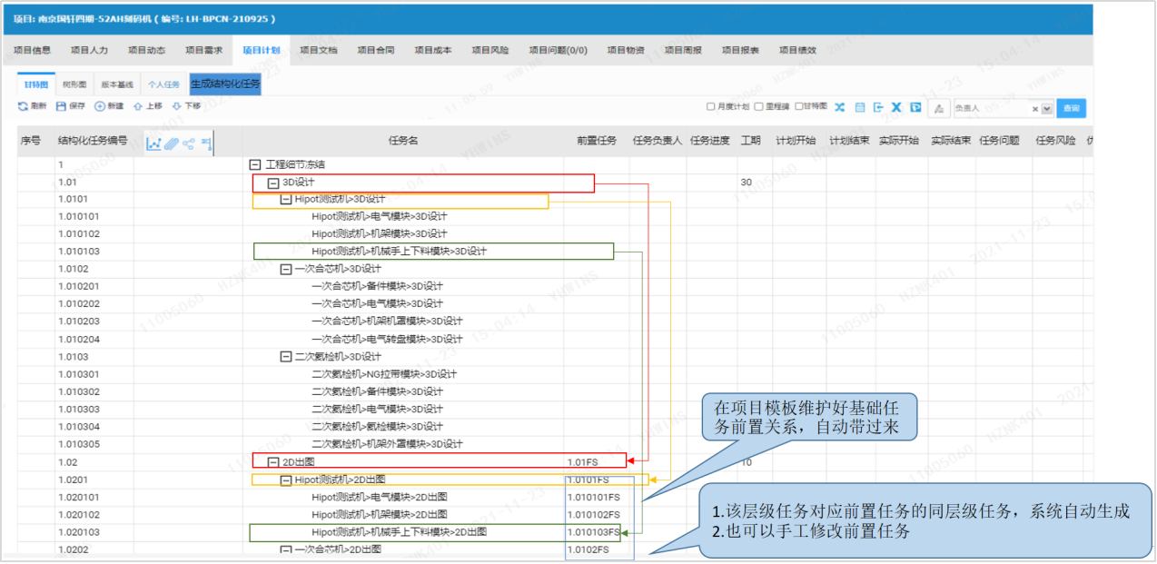 支持无限层级的WBS任务计划拆分,确保项目管理的精细度与项目规模相匹配。 在线编辑项目计划,明确任务间的逻辑与依赖关系。 甘特图直观展示项目计划,实现团队间的便捷共享。 02、支持根据模板生成项目计划,自定义项目模板可维护 模板化生成项目计划:支持标准化项目计划模板管理,自定义项目任务分解结构(WBS)和里程碑计划,设置标准工时、工期,前后置任务关系和关联的交付物文档和审批流程等。根据模板生成项目计划时,复制项目计划模板快速创建项目计划。 自定义模板维护:支持在项目执行过程中根据模板插入项目子计划,在项目执行过程中,对主项目计划的多个机台,可以通过插入项目子模板的形式动态生成细化的项目子计划。