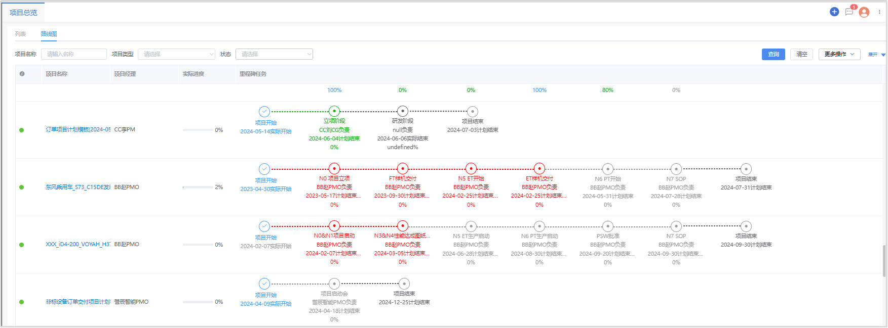 通过项目总览列表和里程碑路线图,一目了然地展示多项目进展(包括正常进行、轻微超期和严重超期的项目),便于管理者快速定位并深入了解项目的具体情况。