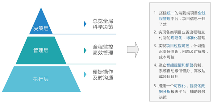 第一、通过项目管理系统打通项目业务全流程,将各领域项目进行系统管控,从而提升效率,降低成本。