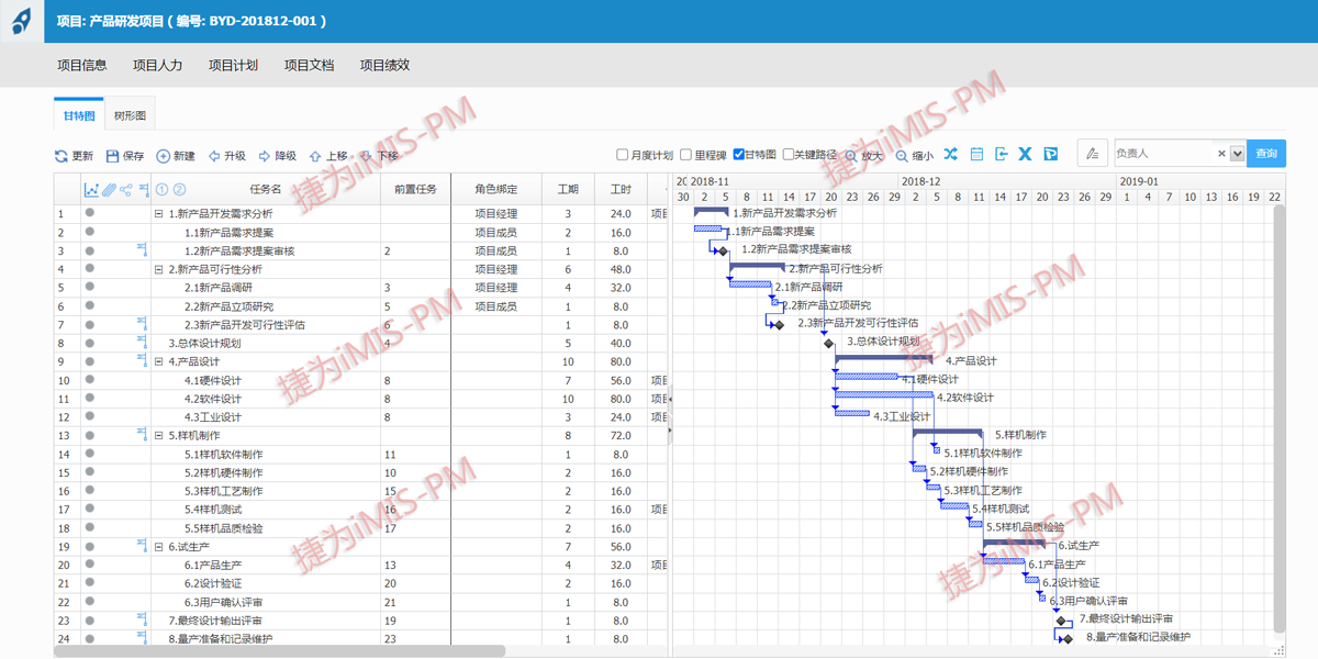在“项目计划管理”功能模块,捷为iMIS-PM集成项目系统协助项目经理结合公司现状,基于每家车企独特的开发流程,分析新车型研发项目的基本过程,预估各个开发过程的时间,设定项目节点,结合研发项目工作特点和各阶段工时特点分析了工时消耗结构,制定项目阶段进度计划、人力资源计划、文档交付计划、成本计划、质量计划等,设置每个任务负责人、参与人和相应的工作量,设置父任务控制子任务,以任务为基点,以工时为基础单位,逐步细化项目的整个生命周期。