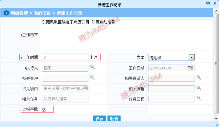 2、填报工作记录(工时):填报工作记录时包括工时信息,还可设置于关联项目、任务等,可选择是否需要上报审批;若审批不通过需重填后再上报。