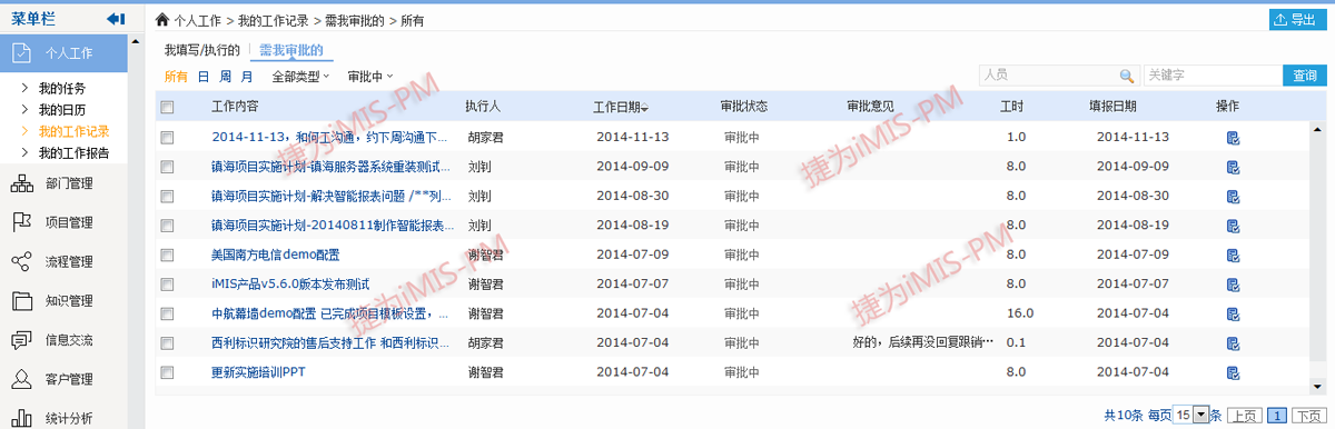 3、审批/评注工作记录:工作记录可由直属上级或任务下达人进行审批、评注、批量审批等;更高一级的领导可以查询和评注非直接下属的工作记录