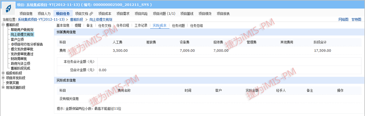 (一)在“项目成本管理”方面。在车型研发项目任务执行过程中,捷为iMIS-PM支持录入项目任务的实际成本,并自动汇总到项目成本中。其中人工费可根据人员的费率和花费的工时自动计算。