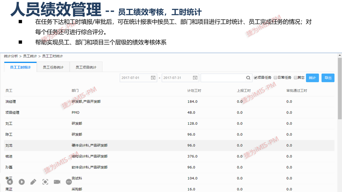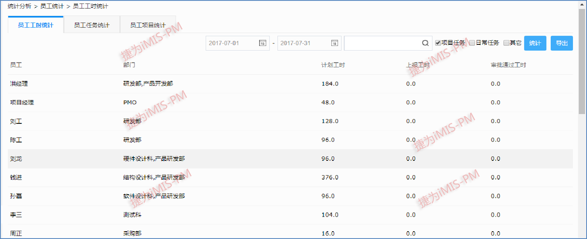 此外,捷为iMIS-PM系统支持各种常用统计报表,支持对当前项目的综合情况、成本、工时、问题、成本偏差进行统计,支持配置项目的智能报表。