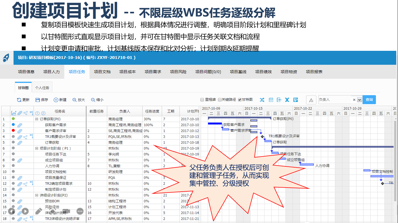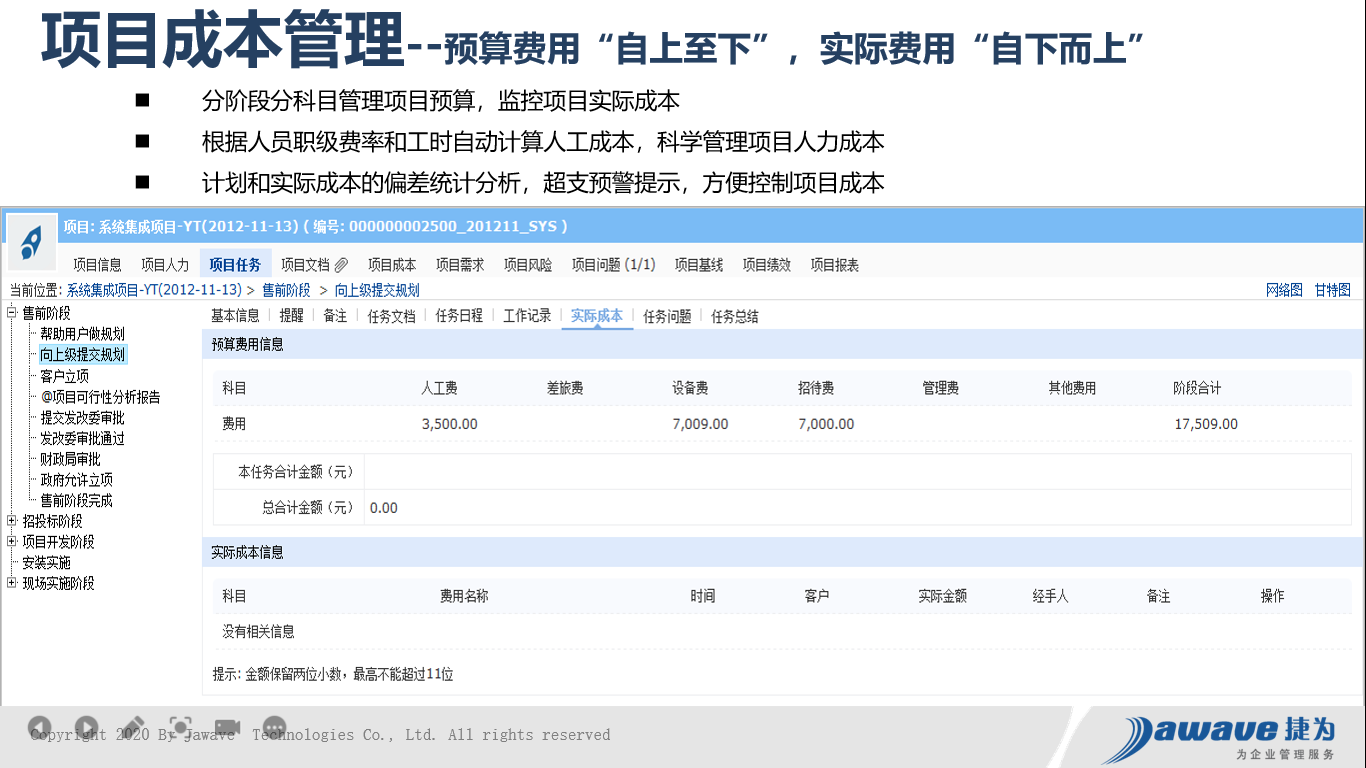 一、在计划管控方面,捷为iMIS-PM集成项目管理系统是企业级的项目管理系统,管理项目的启动、计划、执行、监控和收尾的整个生命周期,覆盖项目的范围、时间、成本、人力资源等各个管理要素,支持项目决策层、管理层和执行层三个层级的工作,为研发组织提供强有力的管理工具。捷为iMIS-PM帮助客户建立项目全生命周期计划,并从不同IT系统中读取技术状态变化、元器件、外包齐套等数据,及时反馈到项目整体计划中来。型号计划节点可与型号研制项目的关键节点建立明确的关联关系,能够反映出关键节点的突出性和重要性;在项目管理过程中加强对关键节点的监控和状态反馈。项目计划在原有的一二级计划基础上继续分解,形成针对研究室、专业组内部的三四级计划,将计划任务的管控落实到人,避免过去计划管控只停留在专业组层级;加强计划具体执行过程的管控,能够及时定位问题和责任人,形成逐级分解支撑的计划管理体系,从而落实计划过程管控和状态实时监控。