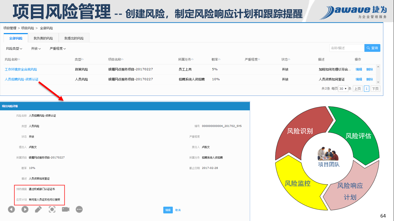五、在风险管控方面,捷为iMIS-PM集成项目管理系统通过不断深入应用形成大数据,对之进行科学分析,可未雨绸缪,对项目计划的高风险区域设置一些衡量指标的门限值,提前预警提醒,同时预留充分的风险处理时间,方便及时采取行动进行应对,避免项目进度延误。并通过分析项目计划执行的过程数据,可帮助找到薄弱和问题环节,进行针对性优化改善,可不断改进项目过程,进一步提升执行效率。