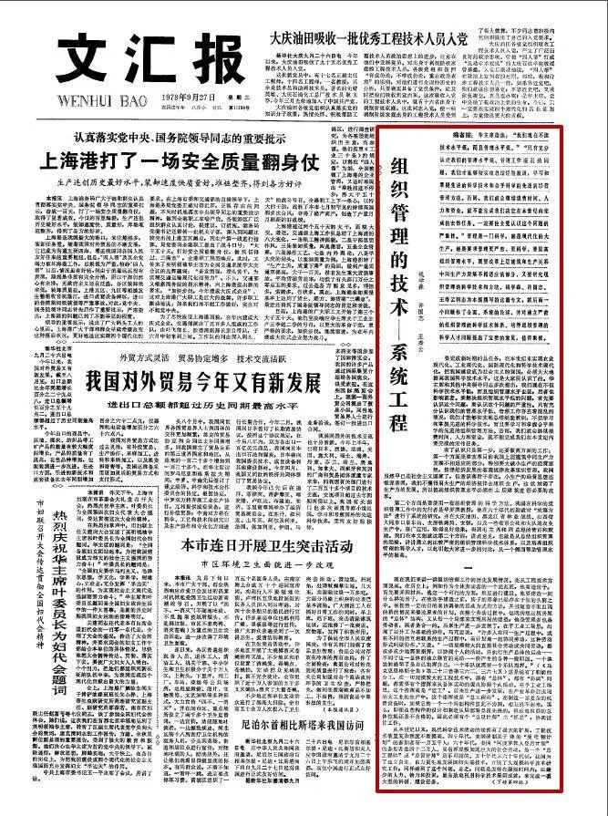 1978年9月27日,钱学森亲自撰写的万余字论文《组织管理的技术——系统工程》一文在《文汇报》全文刊发